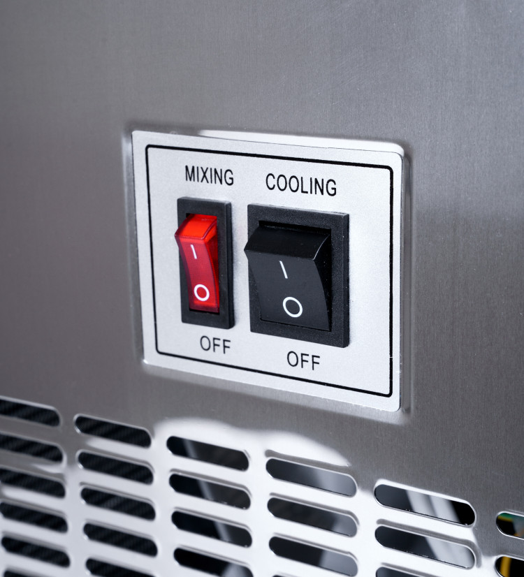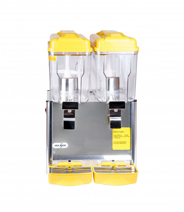 Охладитель напитков (сока) двойной модель 12JL-2 в жёлтом корпусе из металла и пластика. Две ёмкости общим объёмом 24 л, охлаждение и нагрев с лопастным перемешиванием. Мощность в режиме охлаждения 240-390 Вт, в режиме нагрева 1010-1120 Вт. Габариты 45×40×65 см, вес 32 кг. Питание 220 В / 50 Гц. Устанавливается на стол.